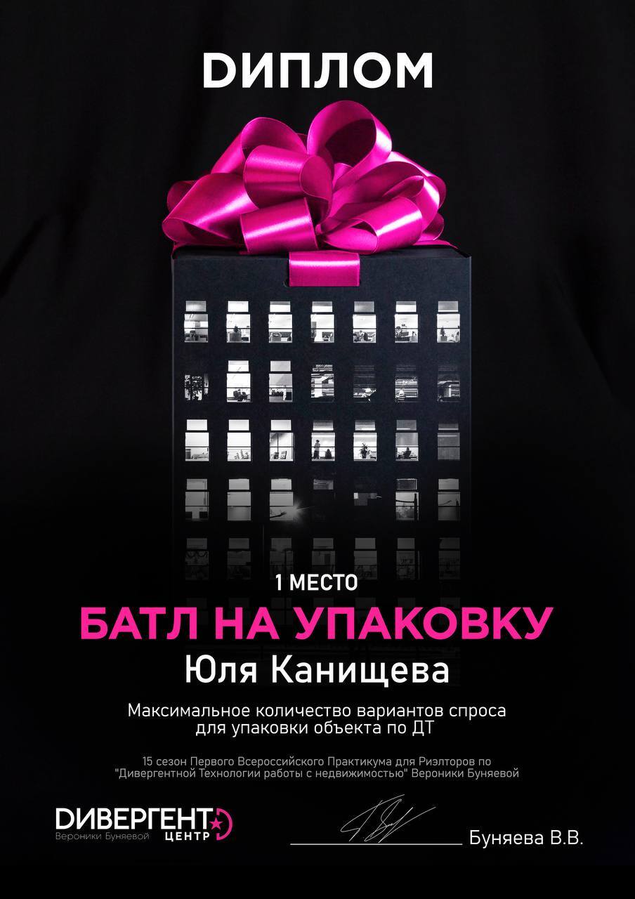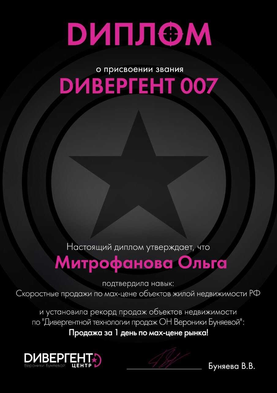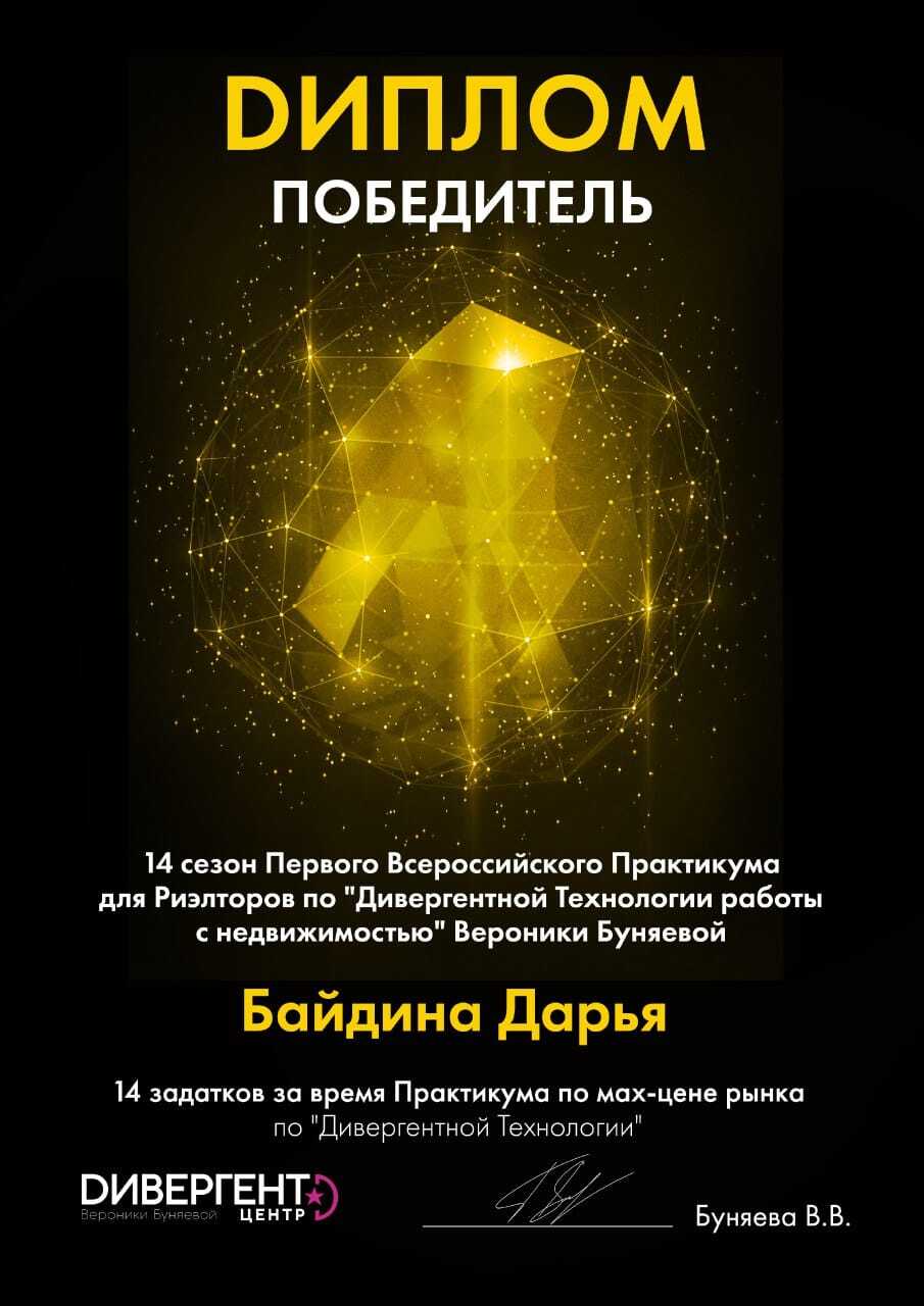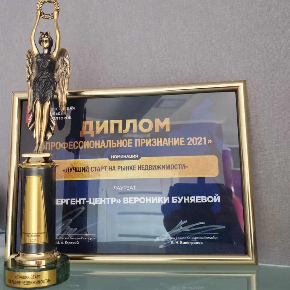 Агентство недвижимости "Дивергент-Центр Вероники Буняевой" - победитель в номинации "Самый лучший старт агентства на рынке недвижимости России" в Национальном конкурсе РФ "Профессиональное признание".
