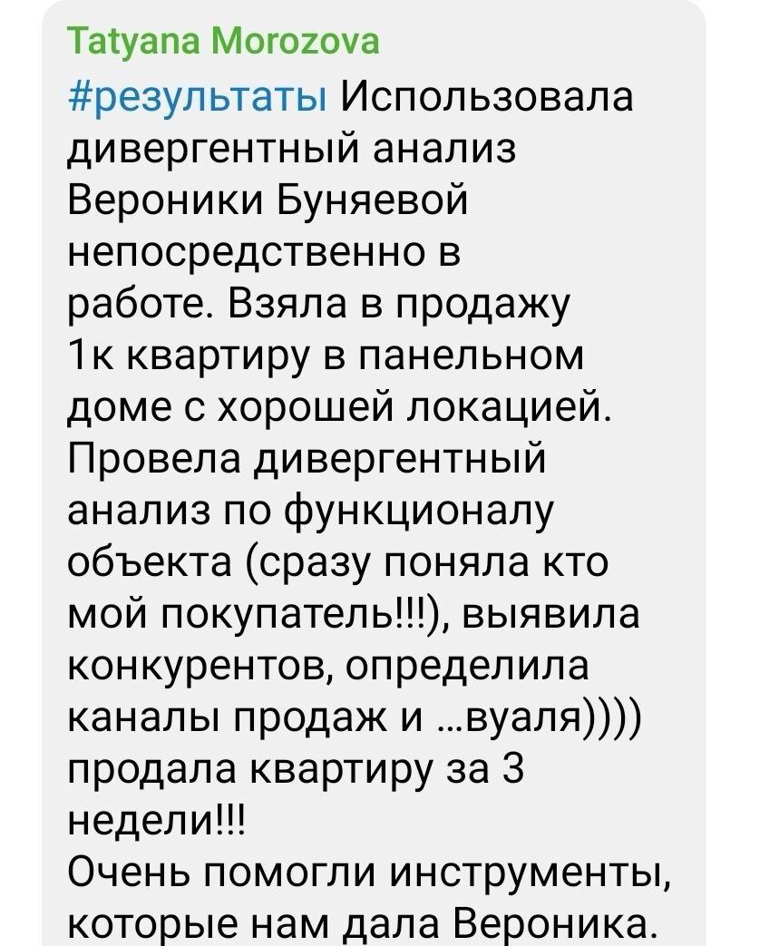 "Дивергентная технология" Вероники Буняевой - это новая философия рынка недвижимости, с совершенно новыми понятиями, терминами, логикой и алгоритмами работы Риэлтора, оценщика и маркетолога по недвижимости!